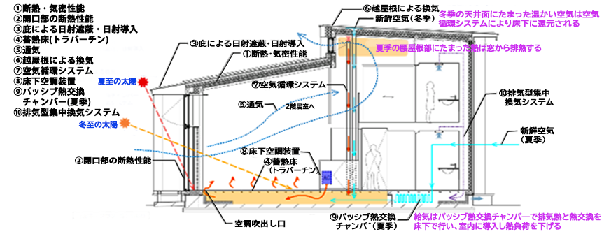 ZEB,ZEHの設計で最も難しいのはパッシブ換気方式である。2007年に七沢希望の丘初等学校では森から新鮮空気を採取し、地中に50mのダクトを入れて地中熱で新鮮空気を暖める(または、冷す)手法を採用した。この時は約7℃の温度差で新鮮空気が上がってくることで地中熱の威力を知った。その後、長久手のたいようの杜では、斜面地であったため床下の容量が大きく、排気空気で新鮮空気を暖める方法を考えた。排気空気を導入した床下は、室内とほぼ同じ20℃近い温度となっており、その中を蛇腹ダクトで新鮮空気を導入している。それ以降は排気空気の熱を新鮮空気に回収する熱交換方式をⅠ種換気(給排気ともに機械換気)で採用しており、この方式は73%の温度交換効率を記録している。これで熱交換に関しては完成したが、潜熱の回収に関する課題が沸き起こってきた。これは温暖化により、外気温が35℃を超え、相対湿度が60%を超えるなど、エアコンを利用しても湿度が下がらないなどの日が増えた。この状況に対応するために、日中の潜熱をどうとるかという課題に現在取り組んでいるところである。