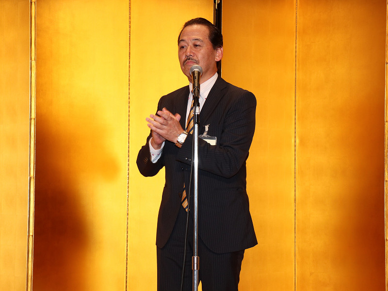 午後6時からは、会場を同じく明治記念館の2F「富士の間2」に移し、情報交換会の開演です。乾杯の音頭を取る弊社取締役部長の立川雅司。