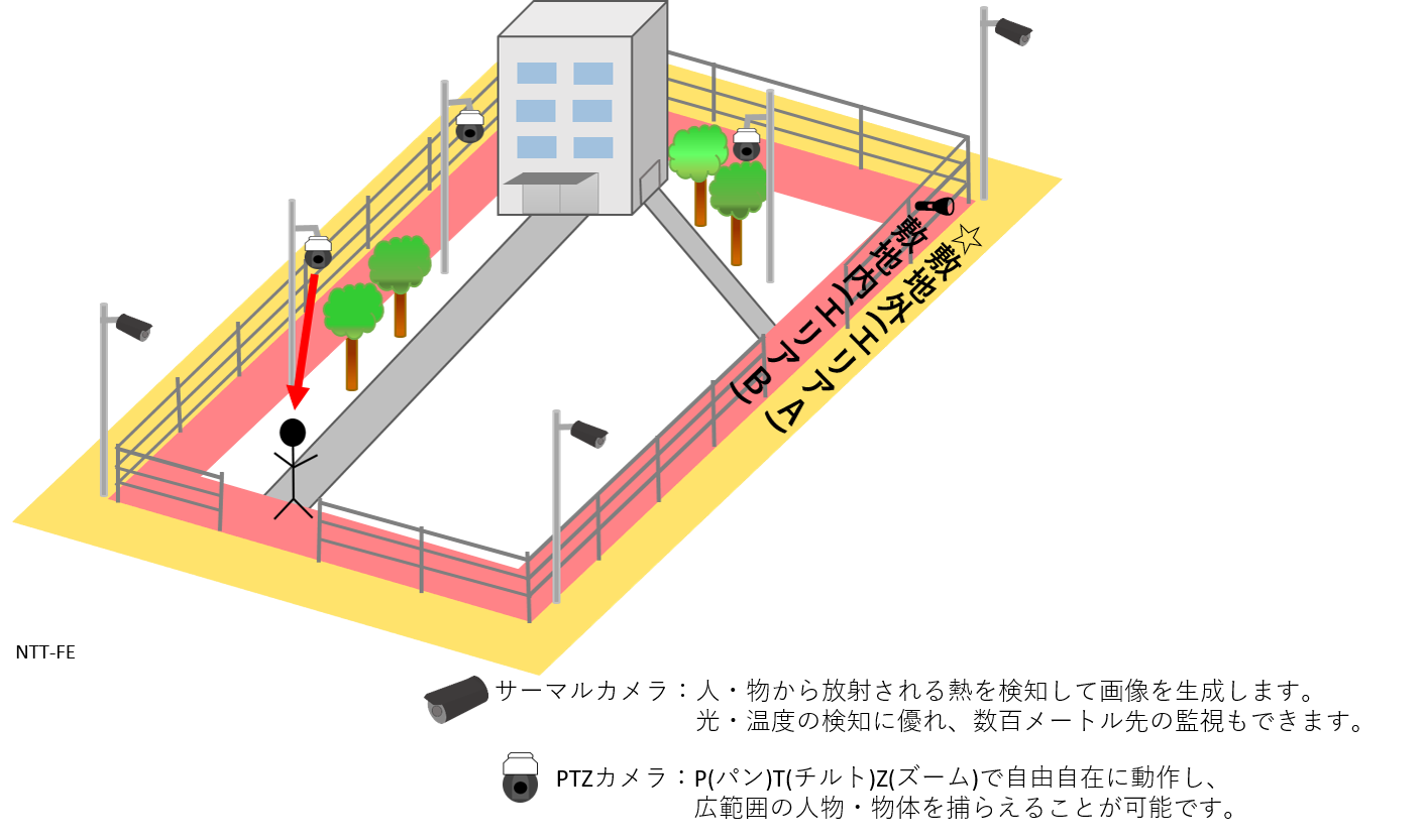☆敷地外(エリアA):サーマルカメラ等で、外周の監視をいたします。
